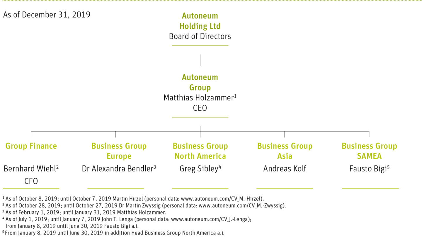 42 companies worldwide belonged to the Autoneum Group as of December 31, 2019. An overview on subsidiaries comprising the names, domiciles and share capital of the subsidiaries and the voting rights held by the Autoneum Group can be found here under note 35. The management organization of the Autoneum Group is independent of the legal structure of the Group and the individual companies.