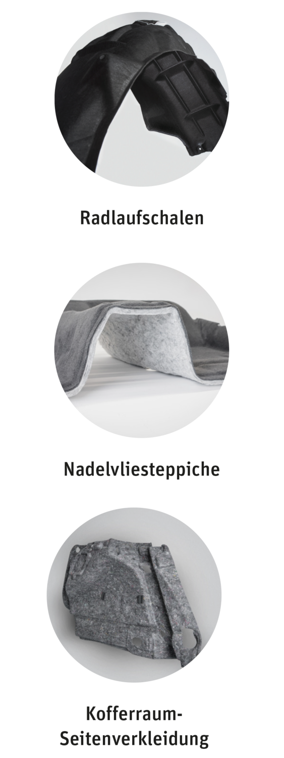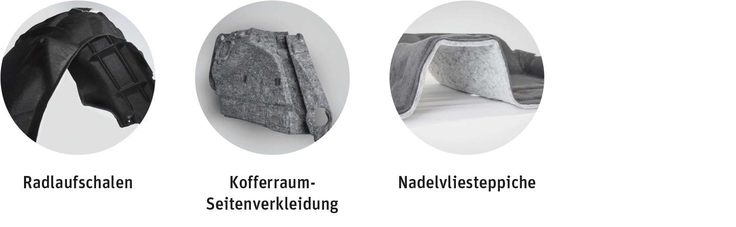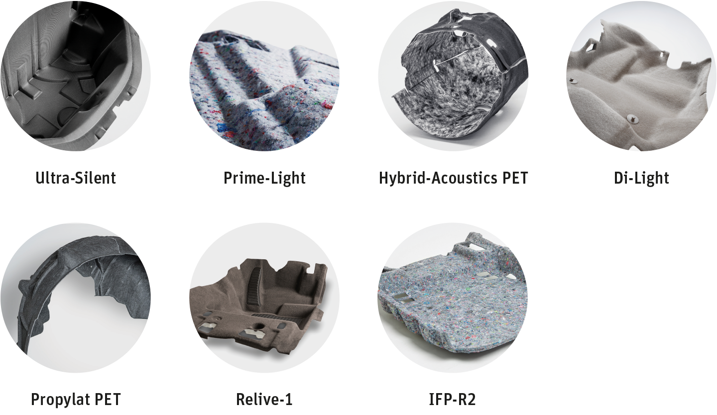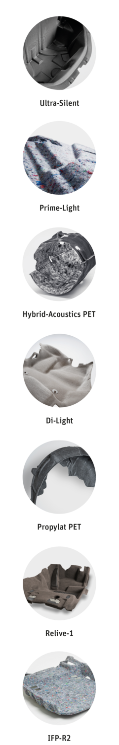 Grundsätzlich können Autoneum Blue-Komponenten auf jeder Autoneum-Technologie basieren, die rezyklierte Polyesterfasern enthält. Die folgenden Produkte auf Polyesterbasis sind derzeit unter dem Label Autoneum Blue erhältlich: